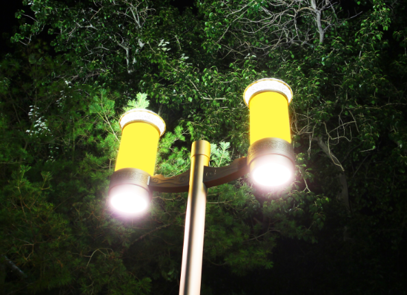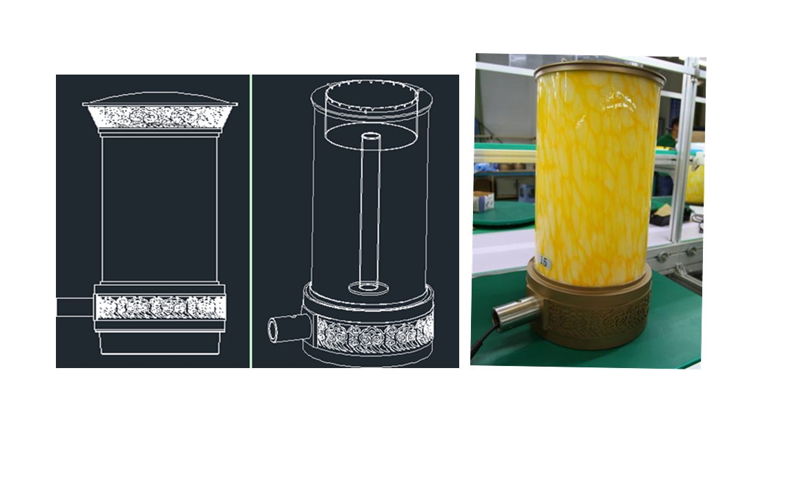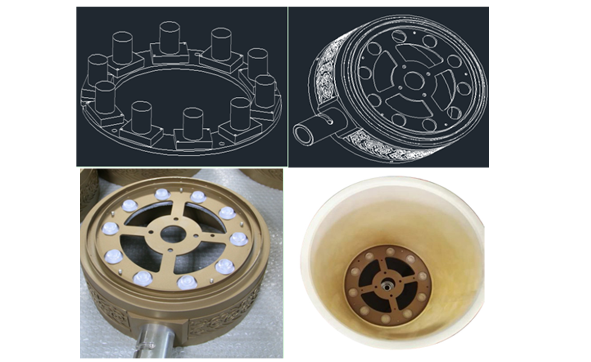 中間部分的LED光源,主要是保證燈筒的裝飾照明,由于燈筒為玻璃材質(zhì),且上照光源下沉,要保證通體均勻發(fā)光,存在很大的難度。對(duì)此LED研發(fā)團(tuán)隊(duì)反復(fù)研究燈筒結(jié)構(gòu),獨(dú)特提出了側(cè)發(fā)光配光方案,為此燈筒開(kāi)發(fā)了側(cè)發(fā)光LED小模塊,此小模塊選用Cree XPG2大功率燈珠,防護(hù)等級(jí)為IP66,并通過(guò)小模塊的組合應(yīng)用,每個(gè)燈筒采用10個(gè)小模塊,采用由下而上的照射方式,巧妙的解決陰影,達(dá)到通體均勻發(fā)光的照射效果。并且由于采用模塊化設(shè)計(jì),維護(hù)方面非常方便。