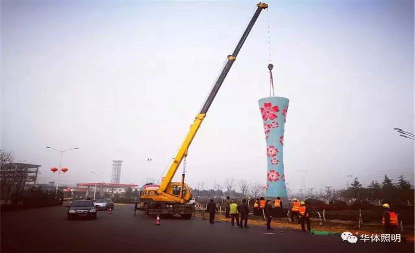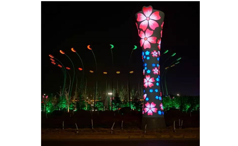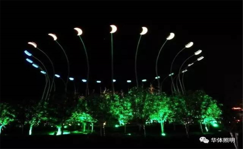 在轉(zhuǎn)盤部分,采用12只10米高的月季花景觀燈柱作為燈陣,甚是好看。燈桿上雕刻的月季花圖案更是奪人眼球,賞心悅目。在月季花景觀燈柱中間還安裝了月牙燈組,設(shè)計靈感來源于月亮的陰晴圓缺等幾種不同的形態(tài),黃、橙,藍、綠顏色也不斷變換,給人美輪美奐之感。