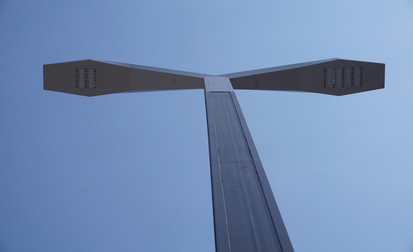 “科技之光“燈桿為多功能桿,雙臂設(shè)計(jì),線(xiàn)條簡(jiǎn)潔流暢。主光源為L(zhǎng)ED 200W,輔光源LED 100W,暖白色調(diào)。