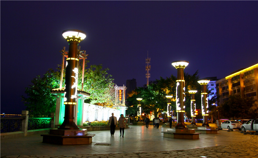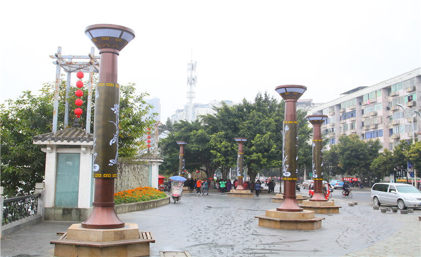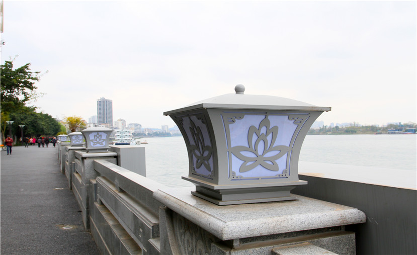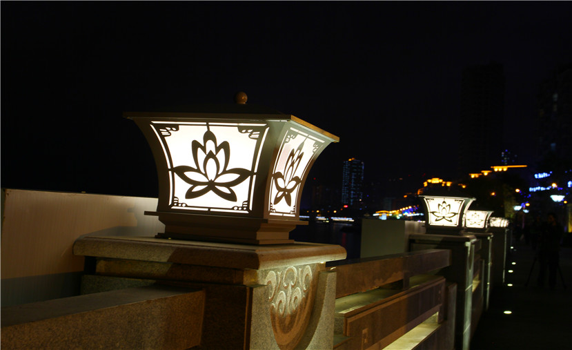 在重要的景觀(guān)廣場(chǎng)上,增加投影燈和廣場(chǎng)燈柱結(jié)合,并在設(shè)計(jì)中加入水紋蓮花古銅紋理和云石蓮花,在白天起到美化廣場(chǎng)的景觀(guān)效果,在夜景中又能展示不同的燈光效果,帶來(lái)富有特色的遂寧夜景。