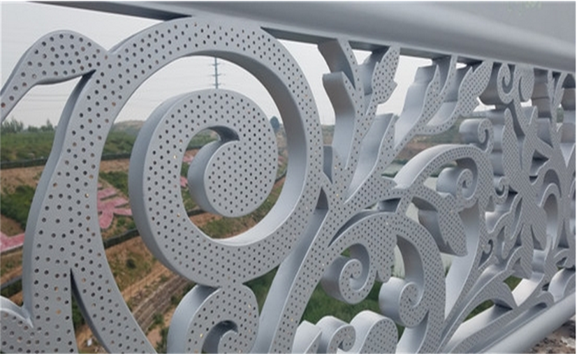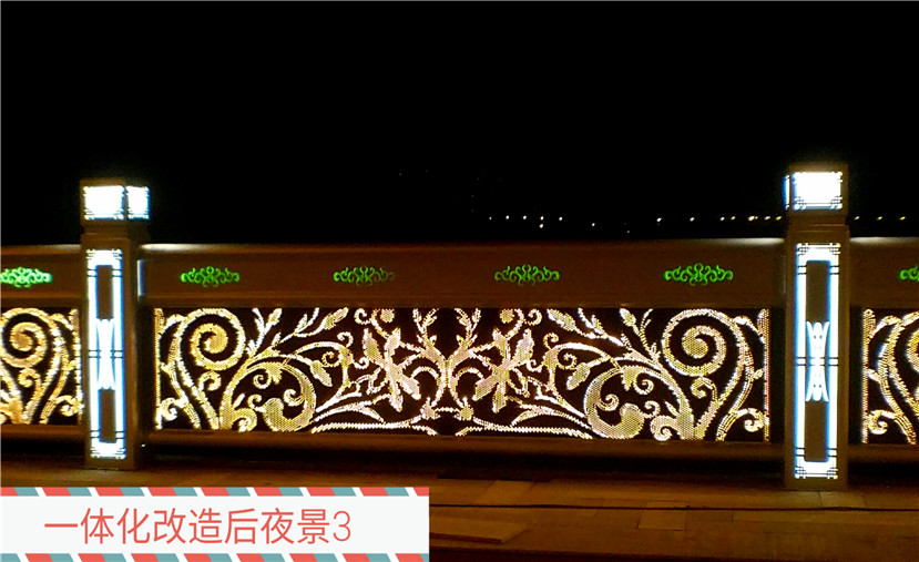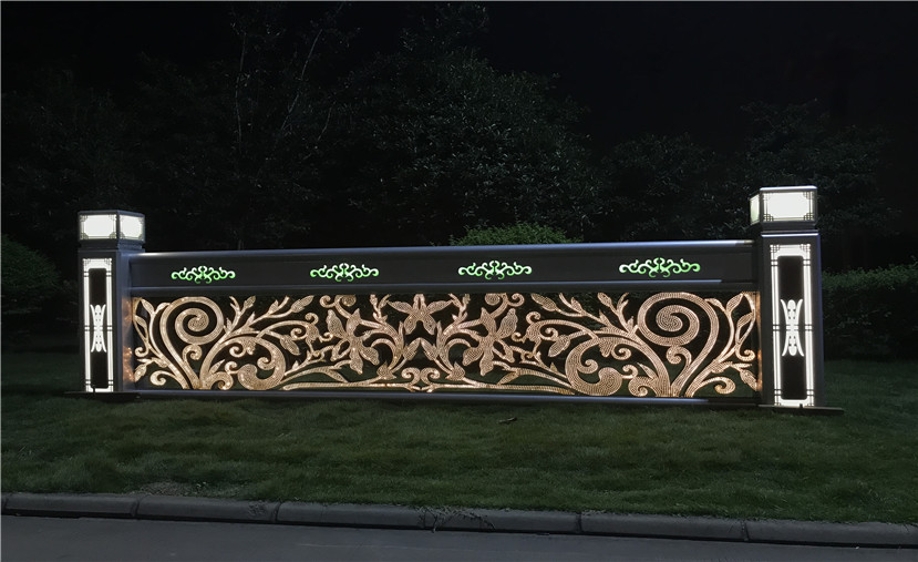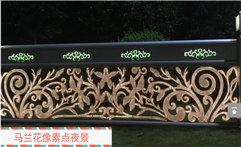 護欄體用不銹鋼材料雕刻、點焊成型。造型是鄂爾多斯市花馬蘭花。作品前后兩面激光切割三千個以上的小孔,作為出光像素點,內貼高目數(shù)不銹鋼防蟲網(wǎng),腔體內根據(jù)造型曲線內埋LED軟燈帶,并用專業(yè)卡扣固定。護欄上部橫向鏤空四朵馬蘭花紋飾,并用帶色透明樹脂填充。
