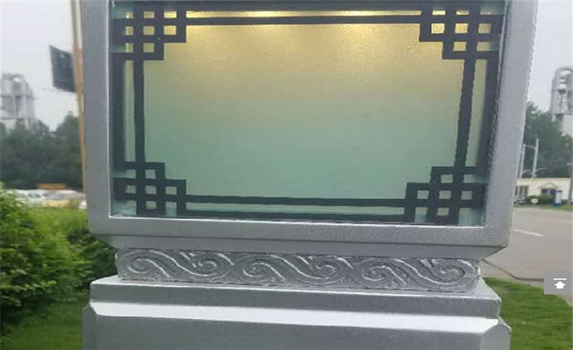柱體前后兩面、柱頭四面用厚度足夠的磨砂玻璃實現(xiàn)內透,玻璃外以陽雕形式粘貼金屬雕刻件,腔內隱藏光源實現(xiàn)內透。