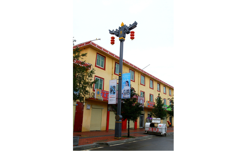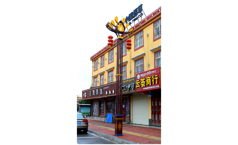 安裝在S209線的“犇?!睙粢愿呱礁吆貐^(qū)特有的珍稀牦牛為設(shè)計元素,牦牛被藏族人民稱為“高原之舟”。設(shè)計者通過燈型主體將牛頭牛角外部輪廓展現(xiàn)出來,塑造了一個栩栩如生、富有力量感和氣勢磅礴的犇牛形象。燈桿中部燈箱絲印臧八寶圖案,內(nèi)置LED光源,愿當(dāng)?shù)孛癖娂槌T冢鞂俸湍?,所求如愿?