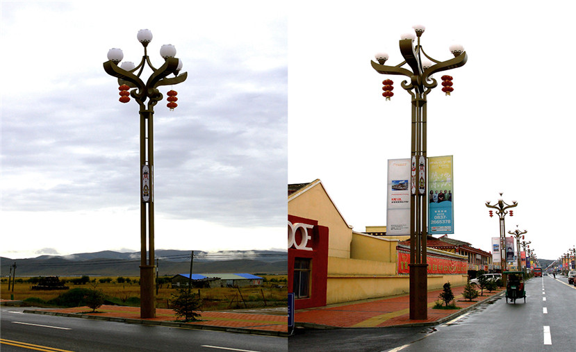 安裝在霞穹街、絳熙街的“佛手”燈以藏傳佛教紋飾為主要設(shè)計元素,燈桿主體以藏紅色搭配藏金色,色彩在藍(lán)天白云下更顯莊重與典雅,底座陽刻象征吉祥如意的藏式紋飾,展現(xiàn)出紅原獨(dú)特的地域風(fēng)情與人文特色。