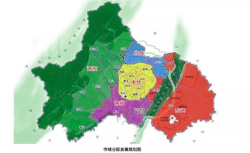 2017年4月,在中國(guó)共產(chǎn)黨成都市第十三次黨代會(huì)上,成都市委書記范銳平正式提出“東進(jìn)、南拓、西控、北改、中優(yōu)”發(fā)展戰(zhàn)略,成都的城市布局由原來的“兩山夾一城”轉(zhuǎn)變?yōu)椤耙簧竭B兩翼”,以龍泉山為界,西邊為中心城區(qū),東邊則將塑造全新的東部產(chǎn)業(yè)新城——東部城市新區(qū)。