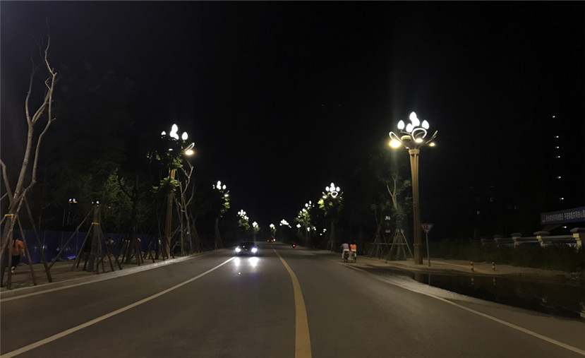 “梔子花開”景觀燈全采用LED光源,在保證道路照明亮度和照度的同時,節(jié)約了能耗,而乳白色的玻罩和夜晚潔白的燈光,與梔子花潔白的色彩和諧統(tǒng)一,猶如“梔子花開”。