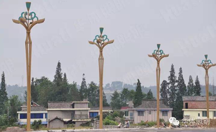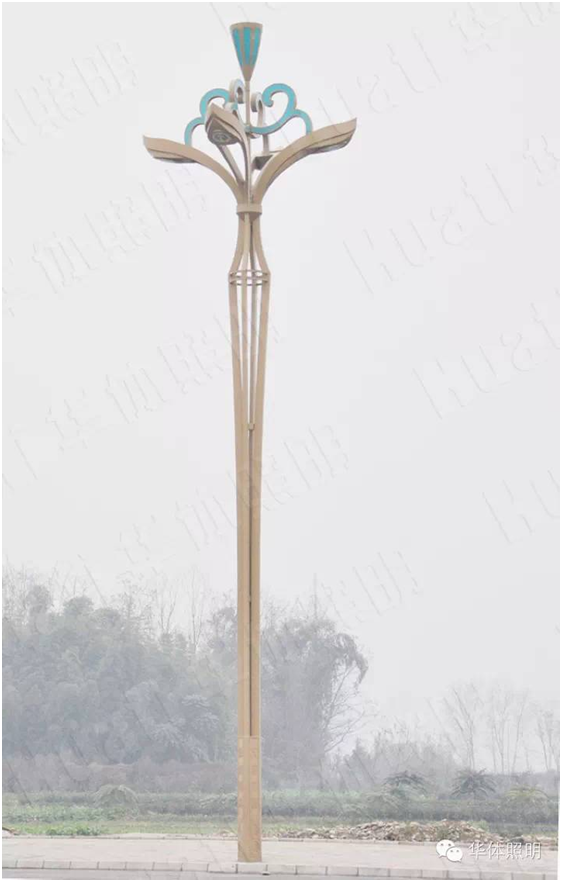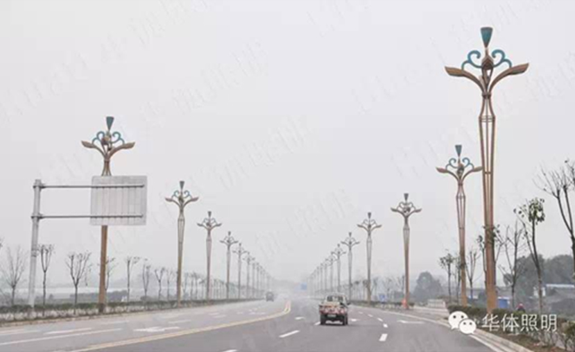 瓦屋山是古蜀著名的道教仙山,而在道教中蓮是修行者的象征,是翩翩君子的象征,因此本次景觀照明路燈選取了蓮花植物造型,并命名為金荷。2014年9月,由華體照明傾力打造的139盞金荷整齊的安裝在瓦屋山大道兩旁。金荷燈高15米,采用花瓣與燈臂的結合,燈具頂部“蓮蓬”生動形象,花紋流暢,將蓮花的婉約風姿展現得淋漓盡致;燈桿底座激光陽刻“綠海明珠,天府花園”字樣,底部融入水紋式樣,復古生動,似蓮生水中。