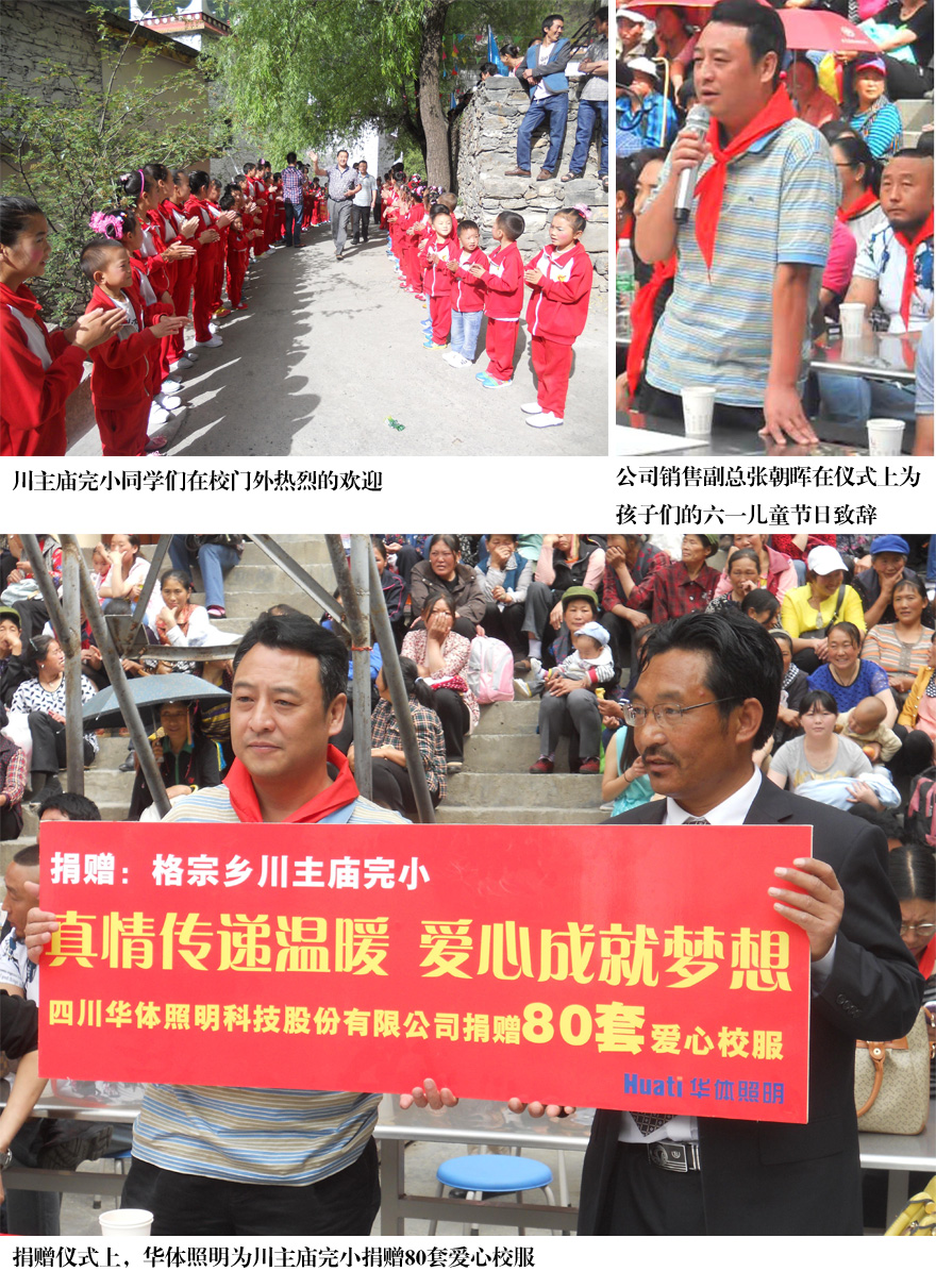 5月30日,四川華體照明科技股份有限公司銷售副總張朝暉一行來到四川省丹巴縣格宗鄉(xiāng)絨壩溝的川主廟完小,與該校同學們共同慶?!傲粐H兒童節(jié)”,并為該校學生送去了華體的愛心——捐贈80套愛心校服,情暖校園。
