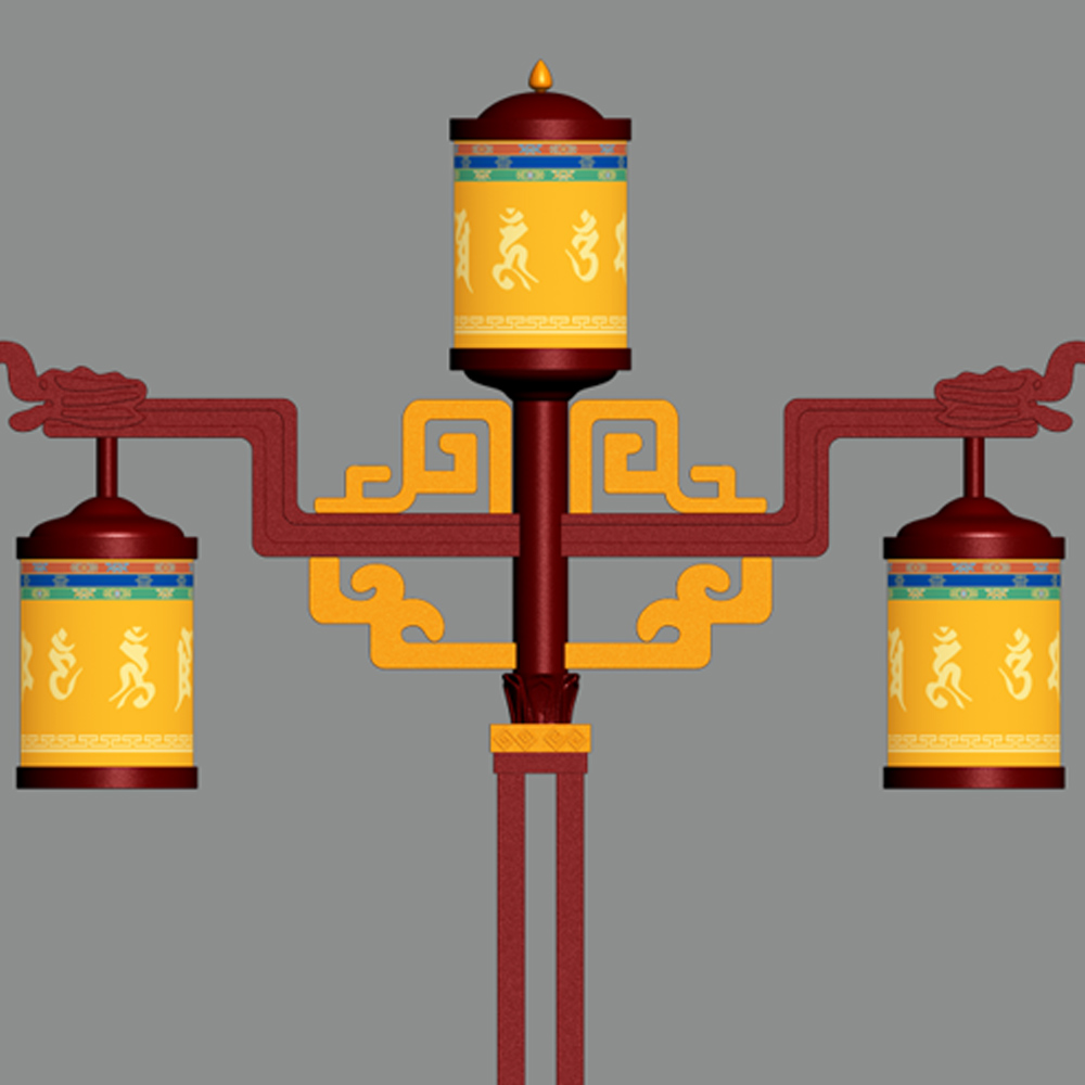 本款燈型具有典型的藏族韻味,藏紅色、藏金色的巧妙運(yùn)用,配合頂部轉(zhuǎn)金筒裝飾,讓燈具更具地域獨(dú)特性,底座鏤空藏傳佛教“蓮花”及壽紋圖案,使得燈具細(xì)節(jié)更豐富飽滿。