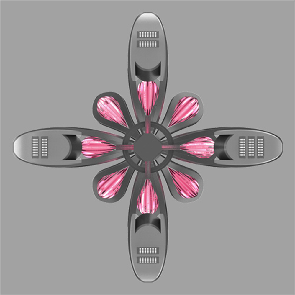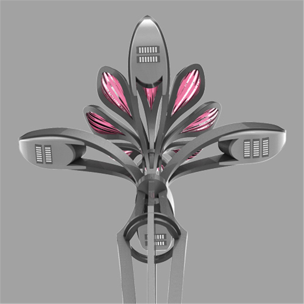 采用山茶花作為設(shè)計(jì)元素,燈桿設(shè)計(jì)成四桿花瓶狀,打破常規(guī)燈桿單一的樣式,主體分為功能照明和裝飾照明兩個(gè)部分,分別對(duì)應(yīng)的是山茶花的葉子、花瓣和花蕾,彩色的裝飾玻罩白天具備一定景觀性,和道路綠化景觀的“四季有花賞”的設(shè)計(jì)策略相融合,夜晚呈現(xiàn)山茶花盛世開(kāi)放的亮麗景致。